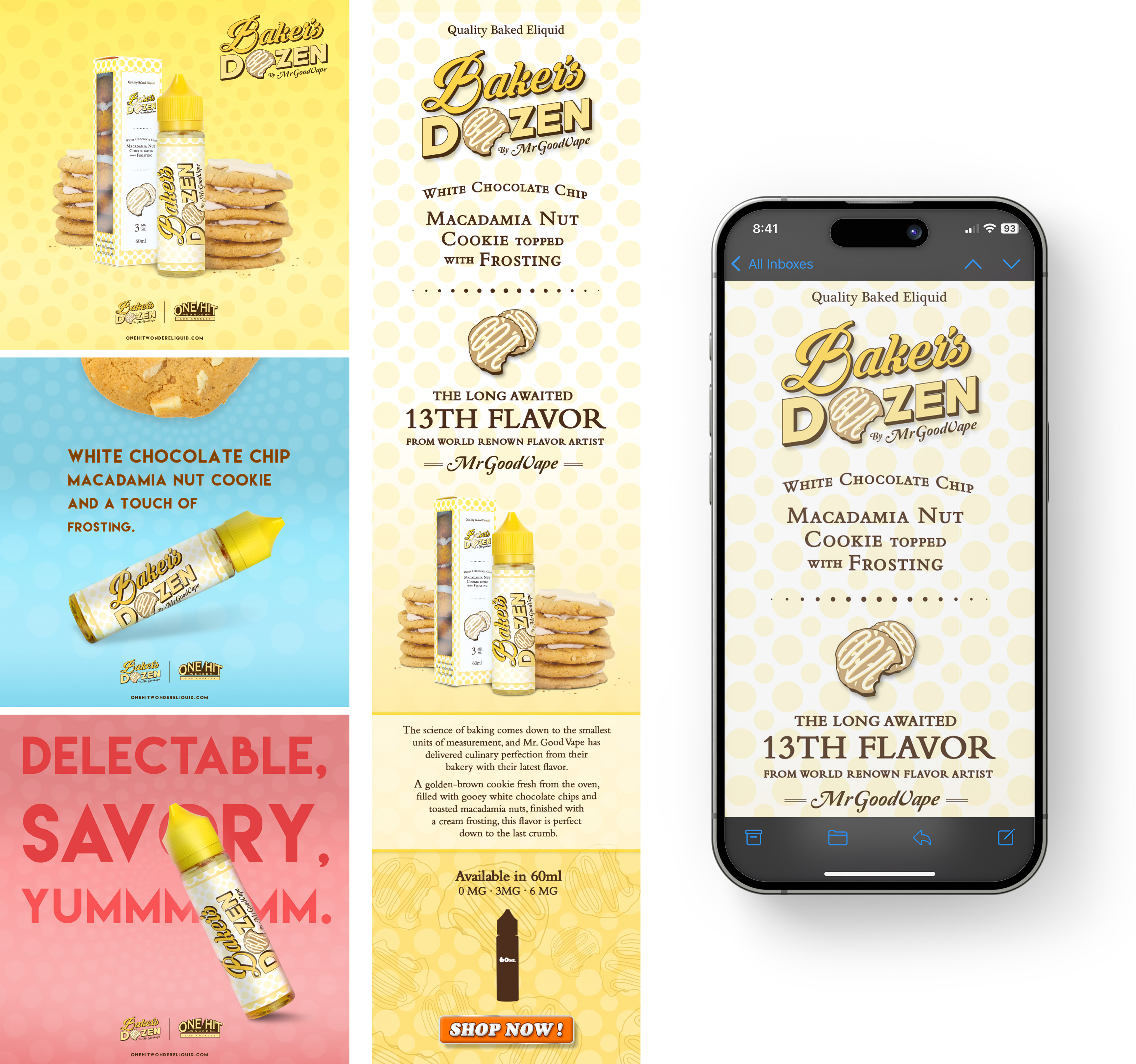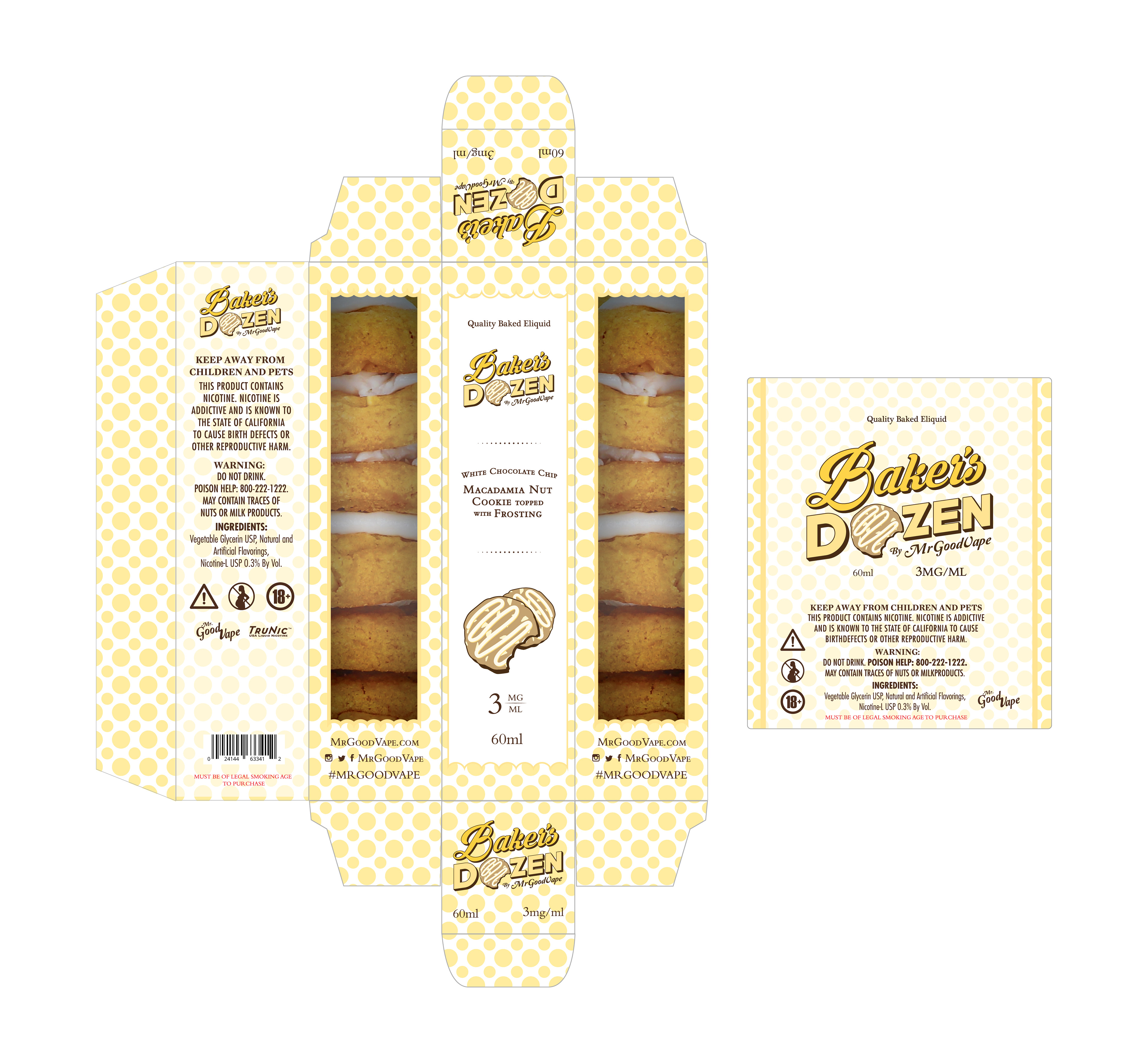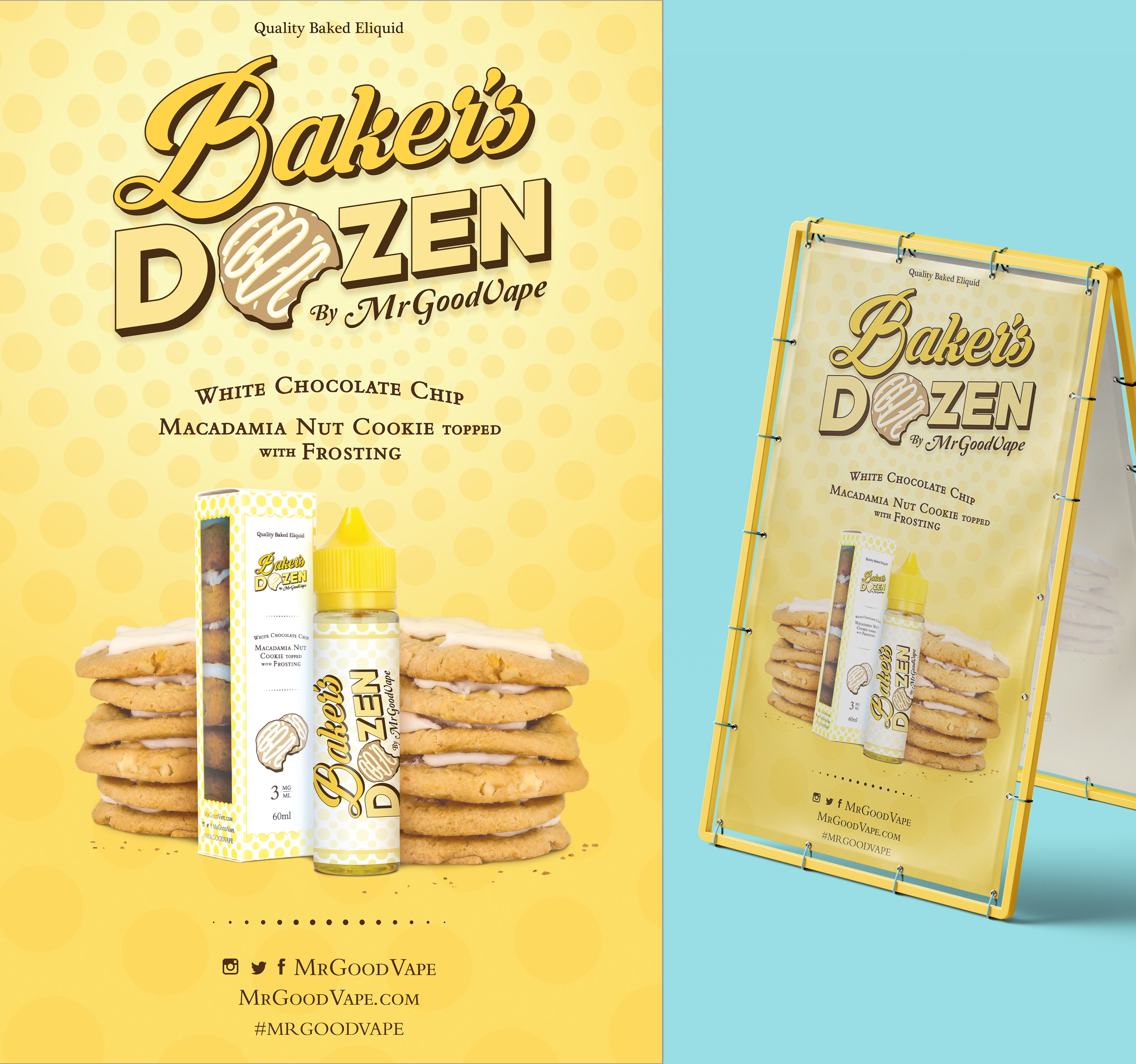 Working with the founder and the product development team, I designed the branding and marketing material's for Mr.GoodVape's latest flavor, Baker's Dozen. I used the original Mr.GoodVape's brand font for the "Baker's" portion of the logo to keep some brand recognition and landed on emphasizing the name instead of the cookie as a point of reference as the box and logo be small over all.