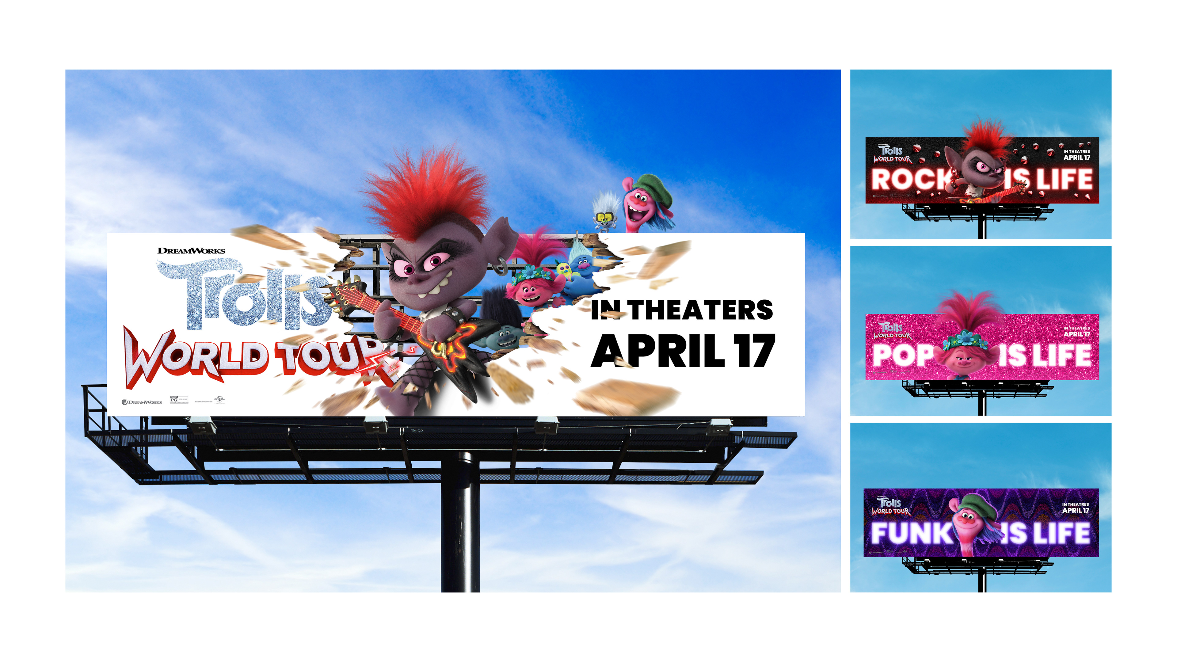 As part of the in-house print marketing team, my designs and art direction were chosen and used as the initial key art for marketing campaign of Universal's Trolls : World Tour. The designs featured on street furniture, transit ad's, posters, and both 3D print and digital billboards worldwide. The last slide features my early ideas that sparked initial interest and later evolved into what was used.